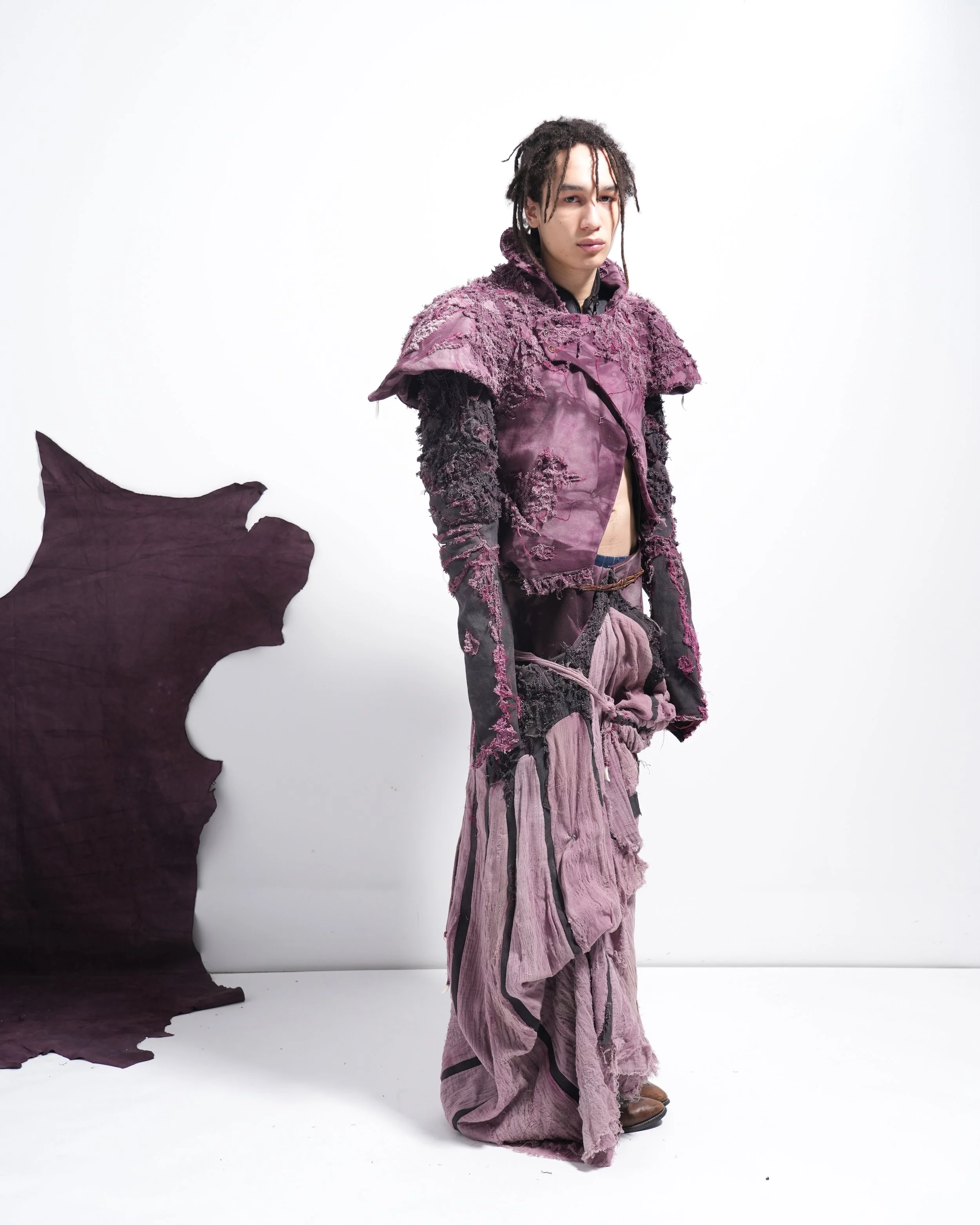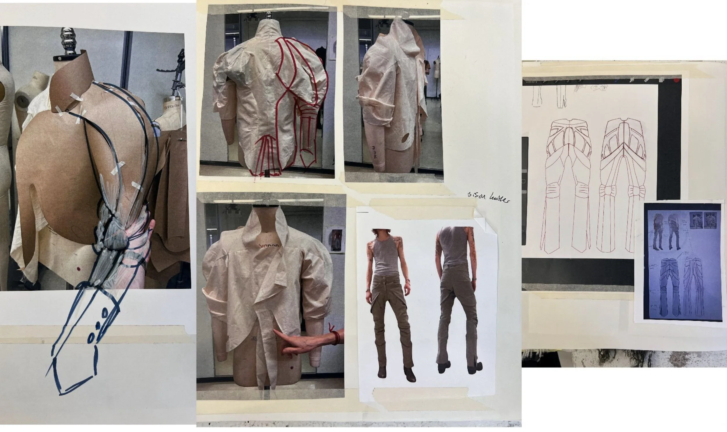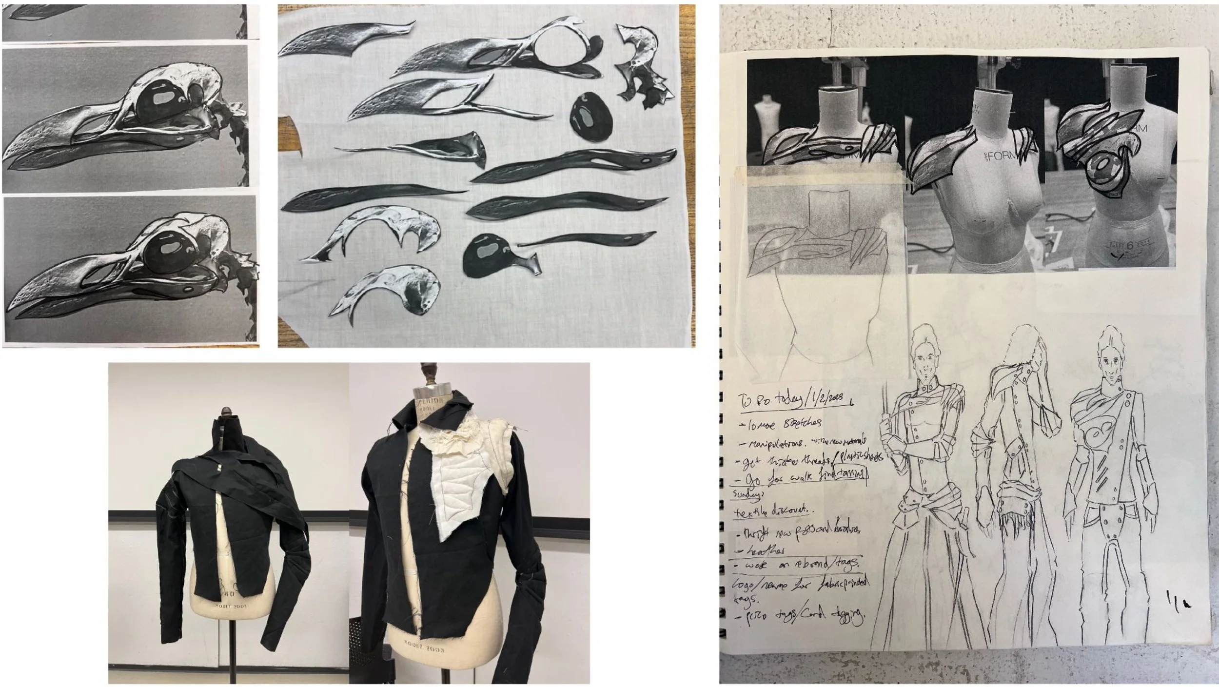 The jacket references the skeletal structure of birds, while the skirt/pant silhouette