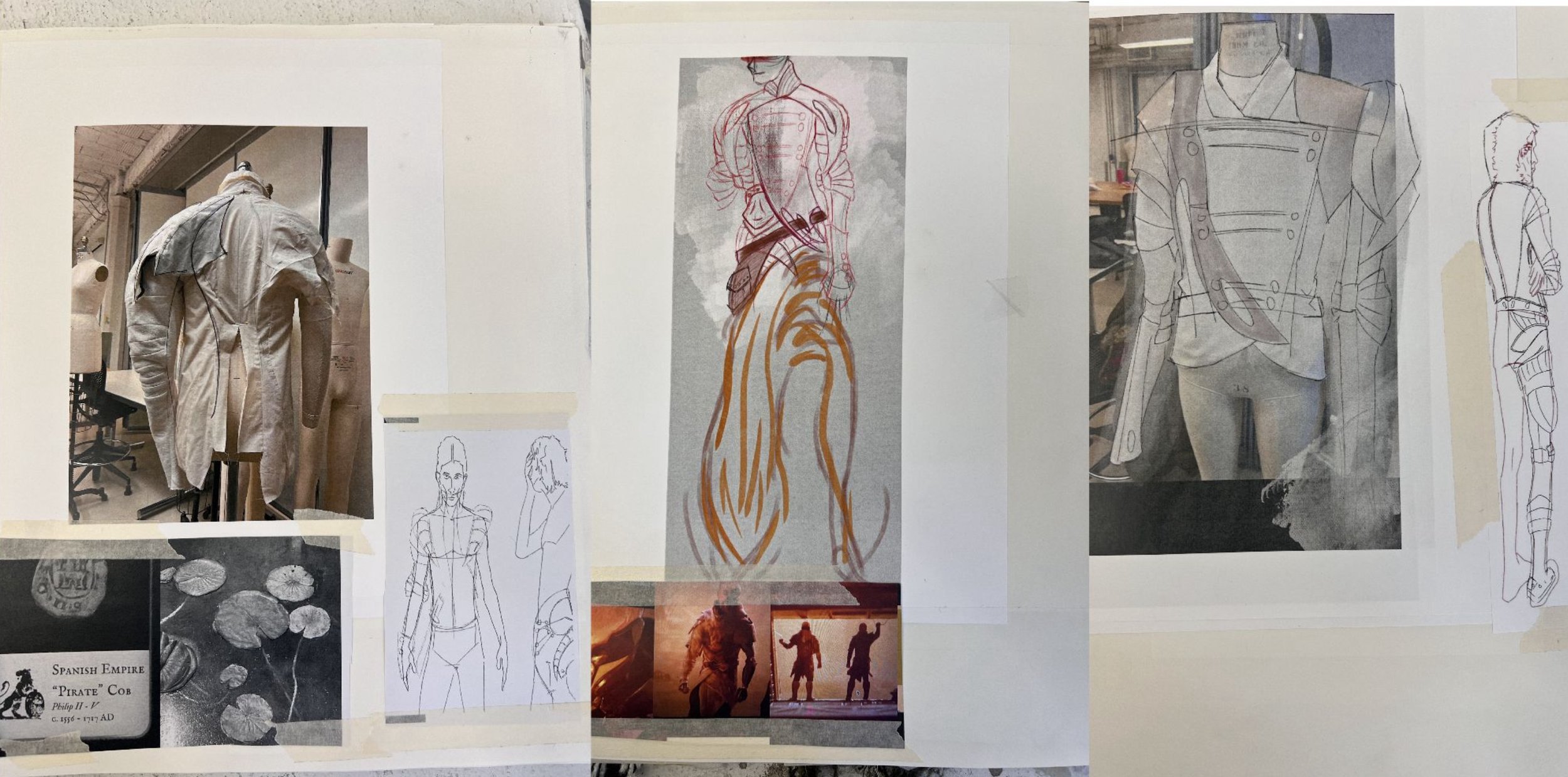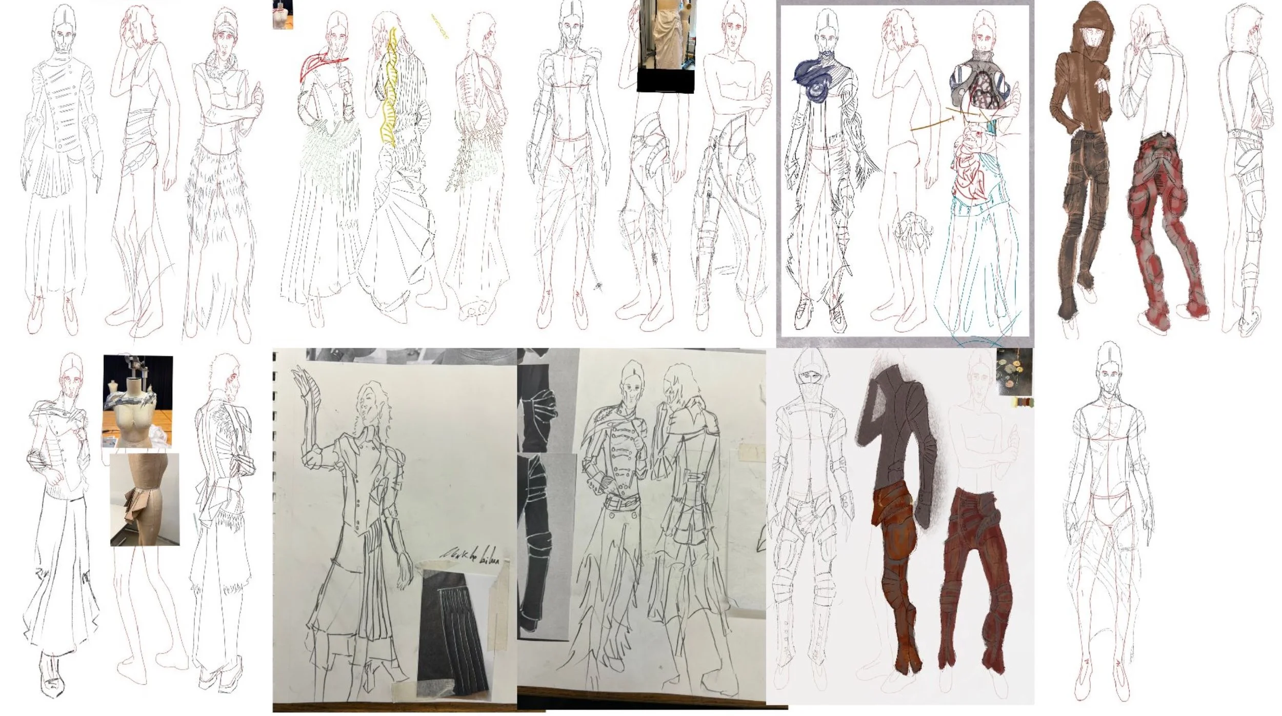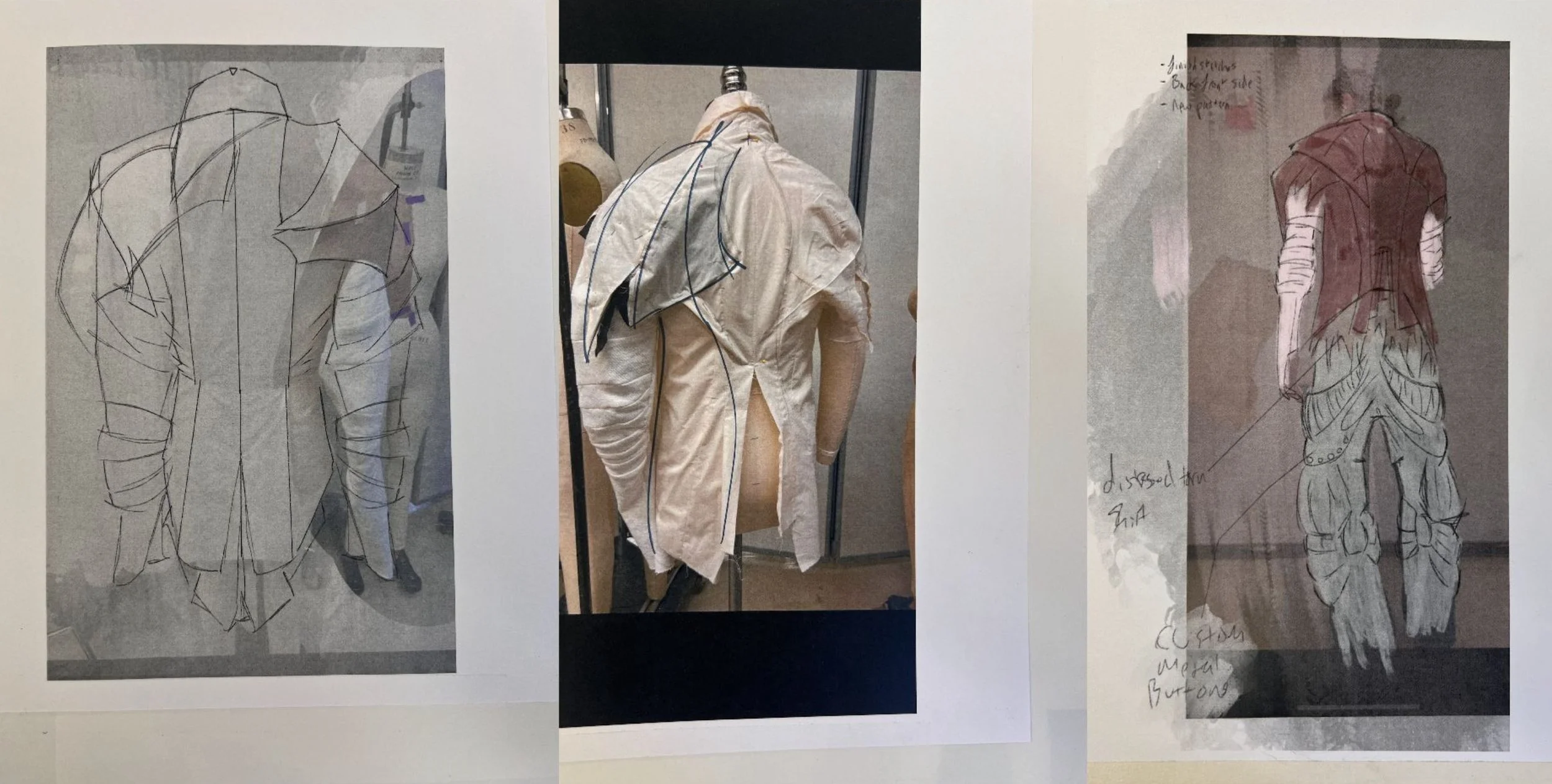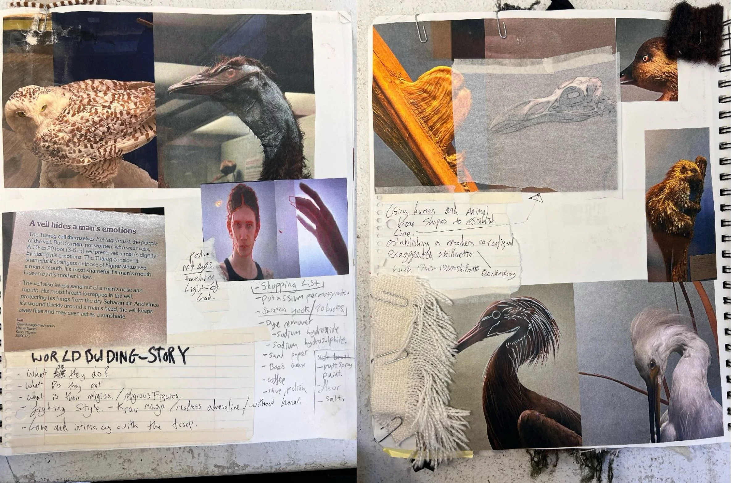 The jacket references the skeletal structure of birds, while the skirt/pant silhouette